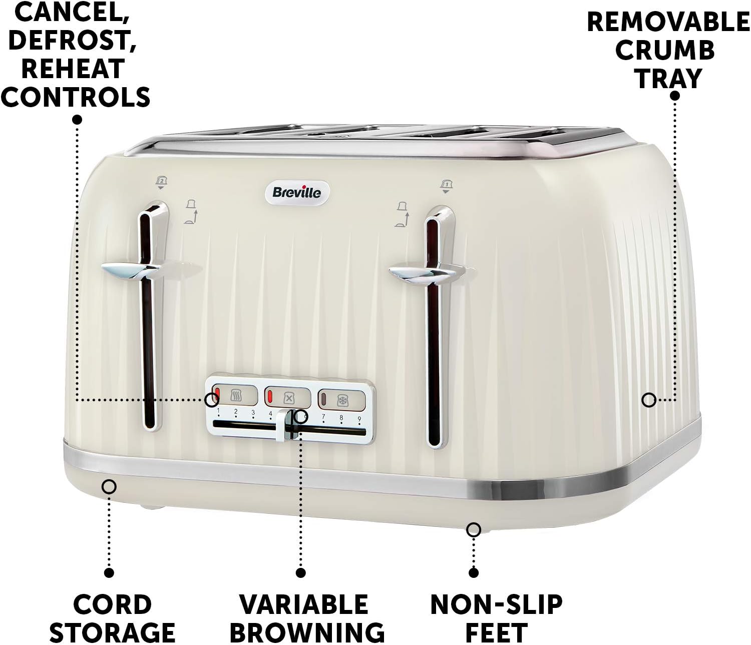 With its sleek and stylish ridged texture and high glossy finish this VTT476 Breville 4 slice toaster is an inexpensive and good looking toaster that looks like it should cost a lot more than it does. This cream toaster has contrasting polished chrome accents and has a modern and contemporary design that will look perfect in any up to date kitchen design.