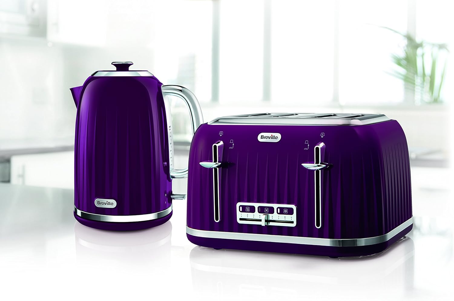 With its sleek and stylish ridged texture and high glossy finish this VTT476 Breville 4 slice toaster is an inexpensive and good looking toaster that looks like it should cost a lot more than it does. This purple toaster has contrasting polished chrome accents and has a modern and contemporary design that will look perfect in any up to date kitchen design.