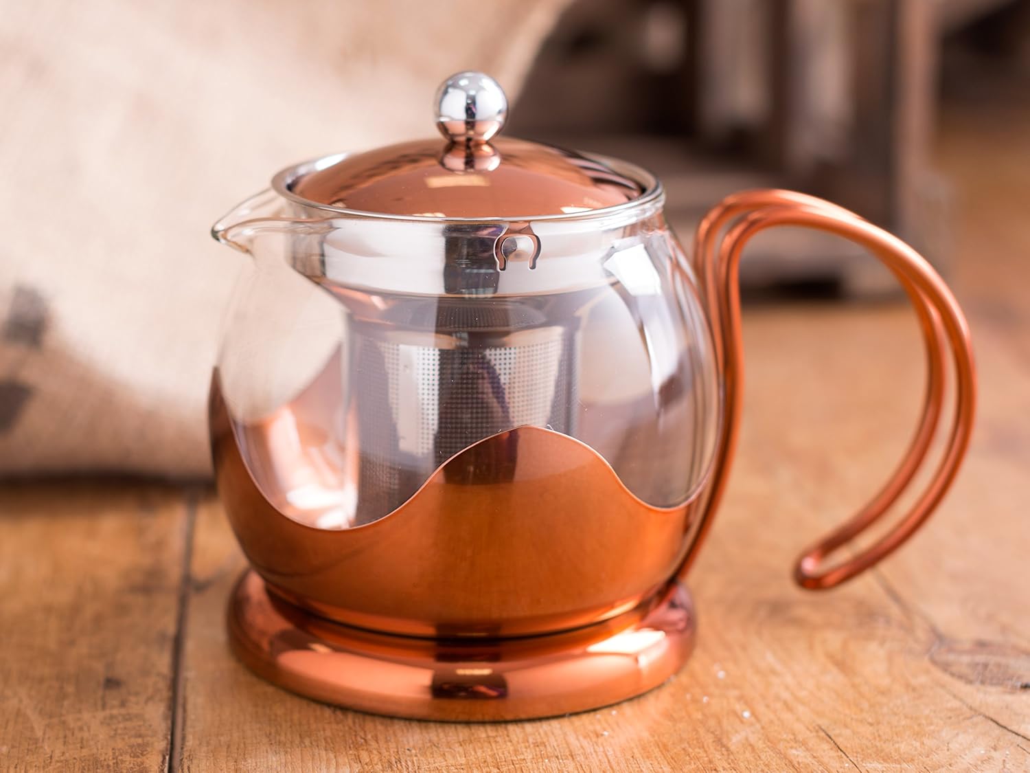 A good looking copper cafetiere teapot that has a large 1200 ml capacity ideal for when you have guests around for coffee, the elegant design is sure to impress and add style to any home or kitchen. The steel frame is finished in a stunning copper coat and the teapot cafetieres beaker is made from heat resistant high quality glass. The cafetiere teapot comes with a stainless steel infuser.