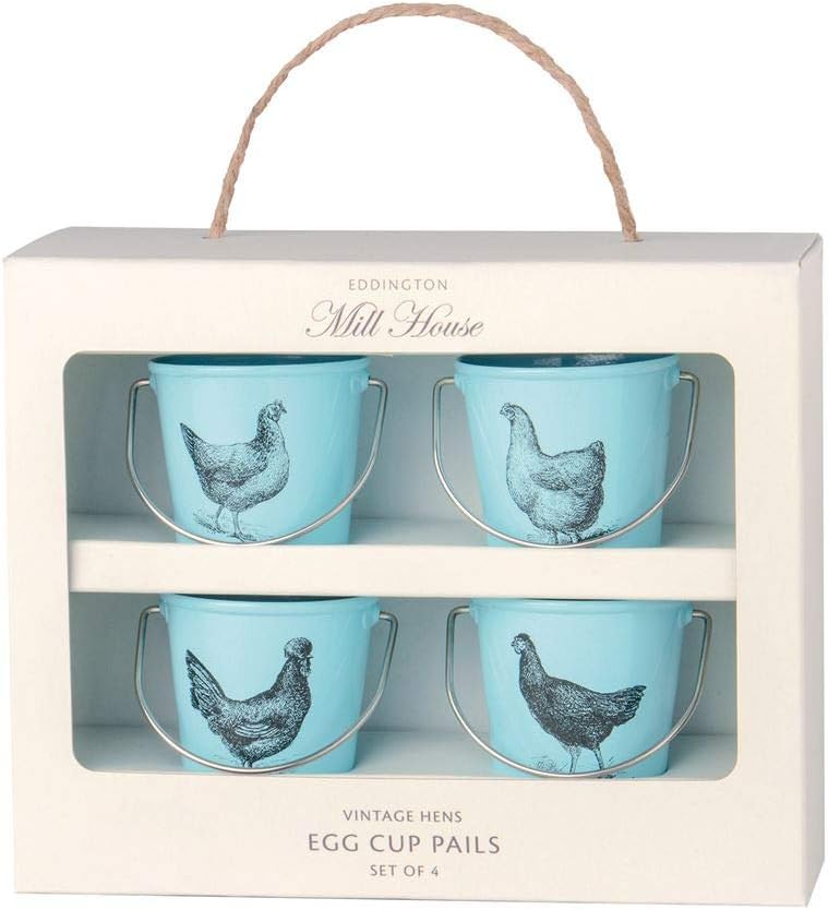 A unique set of 4 vintage style egg cups in duck egg blue enamelled metal. The cups are designed to look like mini buckets and feature vintage style illustrations of chickens. each cup measures approx 5cm/2″ dia x 4.5 cm/1.75″ and the set of 4 comes in a beautiful gift box.
