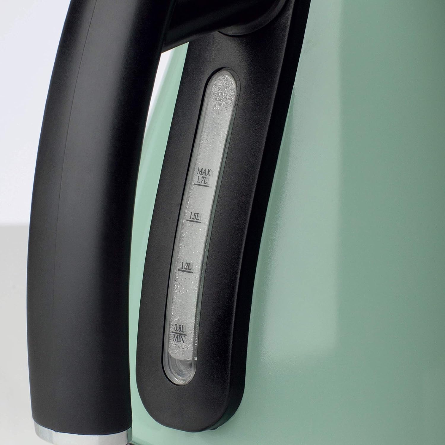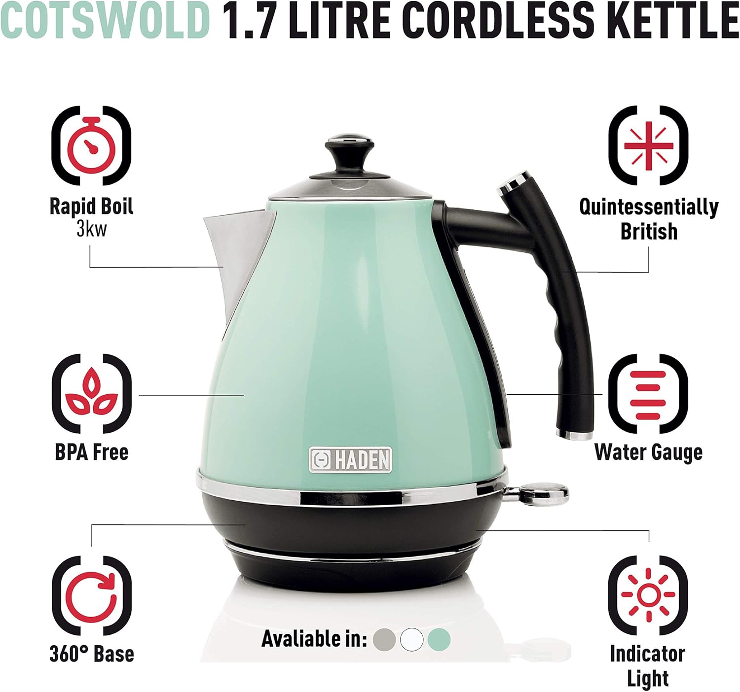 The Haden Cotswold Sage Green kettle has a large 1.7 litre capacity and fast boiling 3000 Watt power.