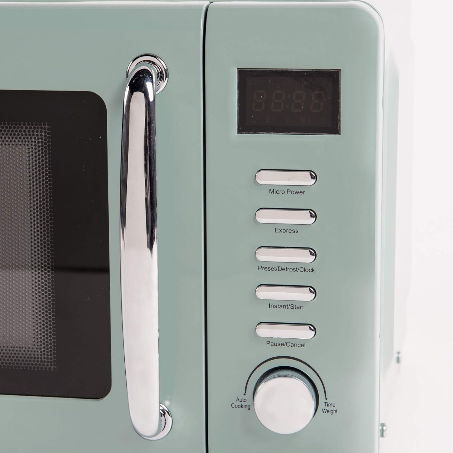 The green microwave features 5 power levels allowing you to control the heating up of food. Functions include defrost, express and reheat settings.