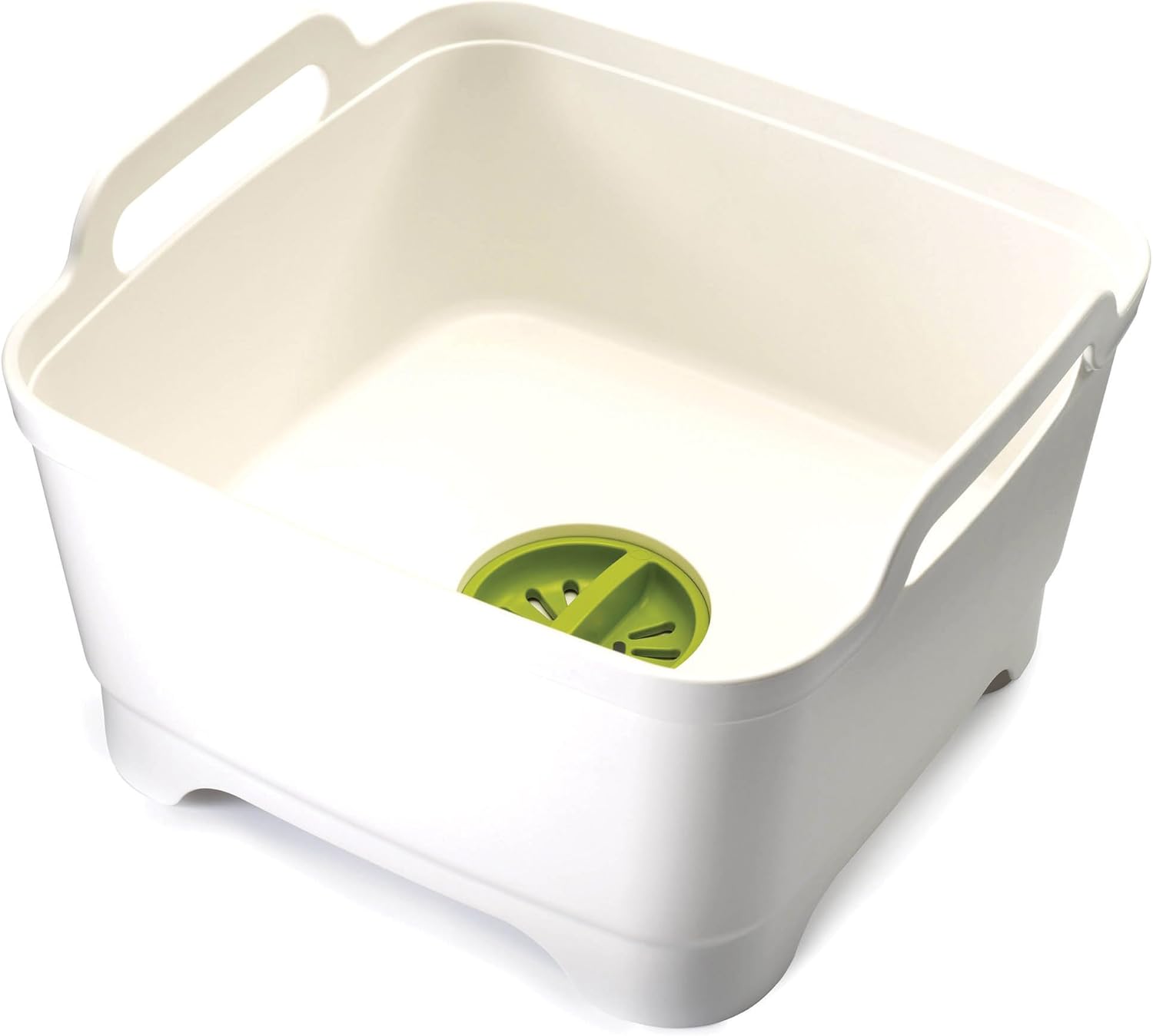 Joseph Joseph Wash & Drain White Washing Up Bowl with removable plug feature allowing you to drain or strain water, eliminating the need to lift or empty a heavy bowl. The straining plug catches large food particles, helping to prevent sink blockages. The steep bowl sides keep water & soap suds inside.