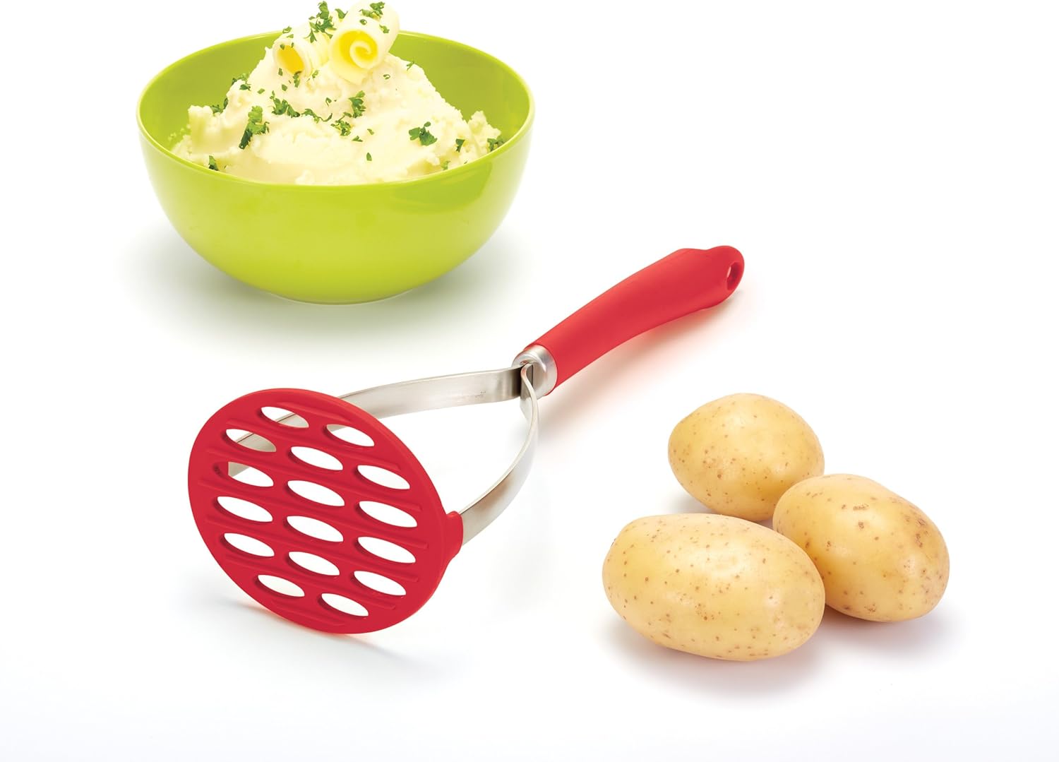 The anti Scratch large mashing plate ensures lump free mashed potatoes without damaging non-stick surfaces. The masher is heat resistant up to 260 degrees Celsius / 500 degrees Fahrenheit and is also resistant to stains and odours
