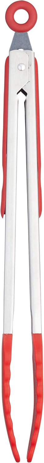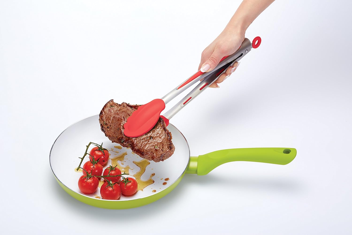 The tongs feature ridged, contoured silicone red gripping plates making lifting food easy and straightforward. The tongs can be easily stored and feature a locking mechanism keeping the food tongs neatly closed when not in use.