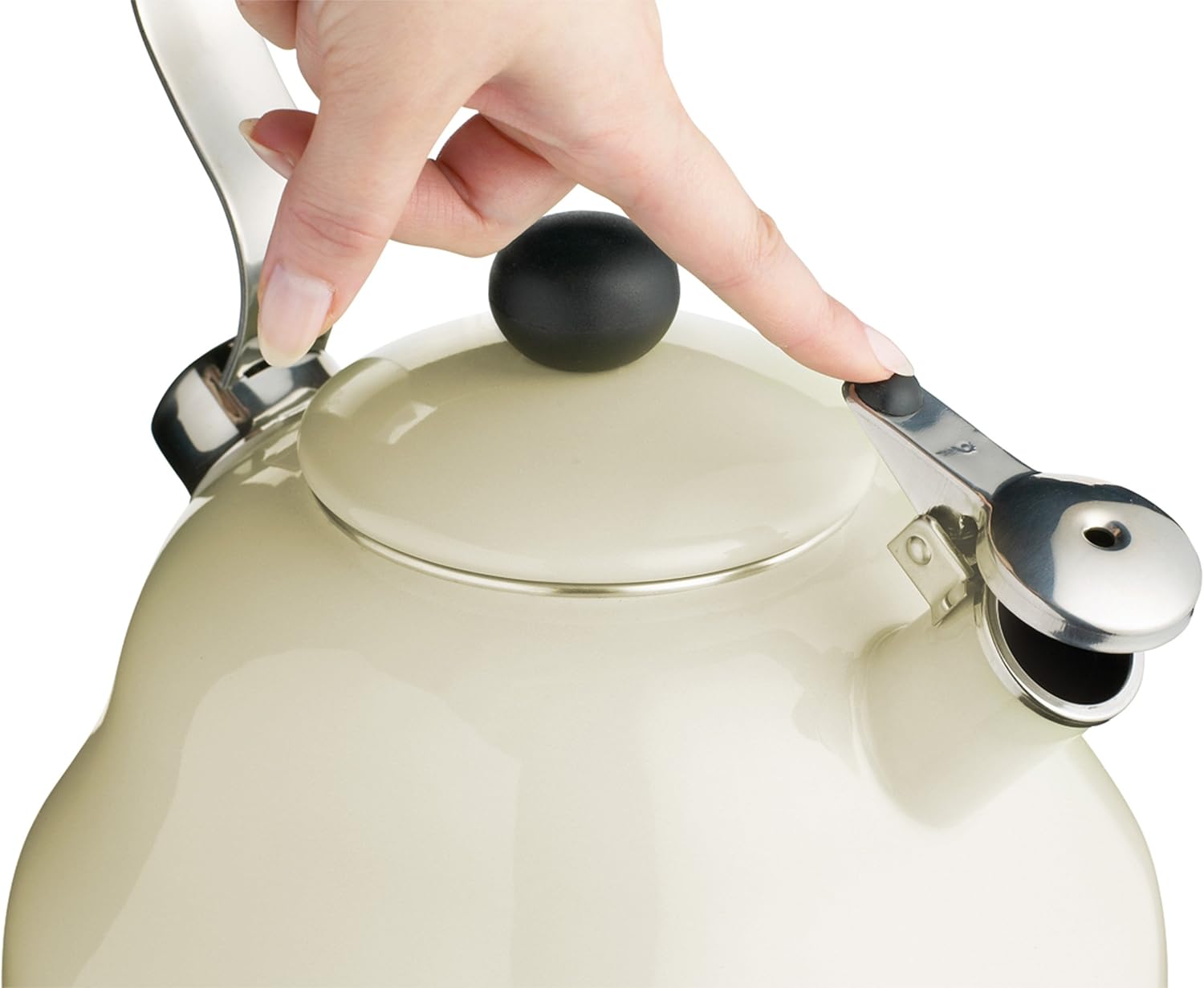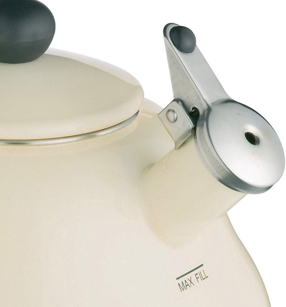 This classic style cream whistling kettle has a durable vitreous enamel coating & features a stay cool, heat resistant handle & knob. It features a flip top whistle with a stay cool push button to open the spout & clear ‘max fill’ level markings.