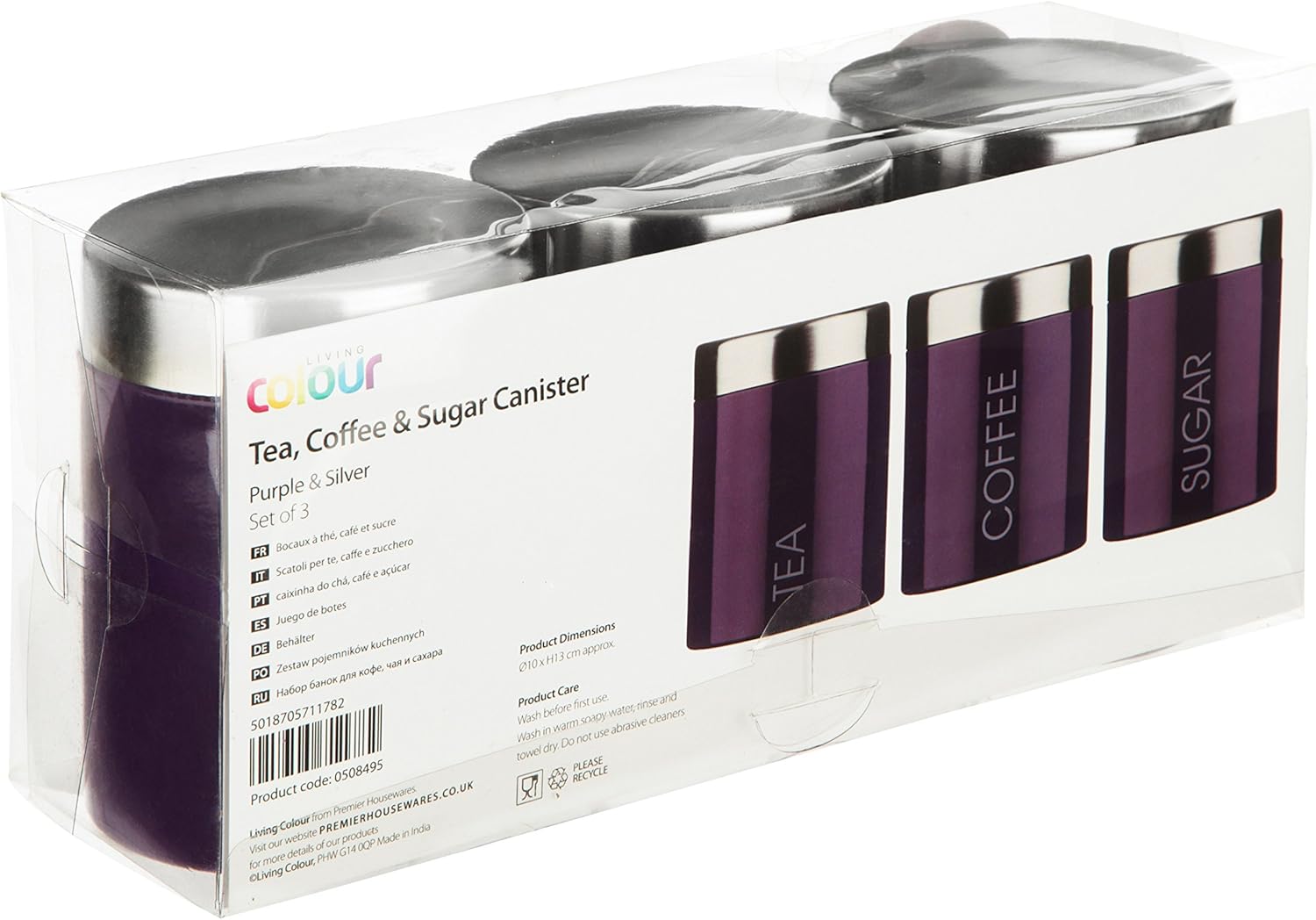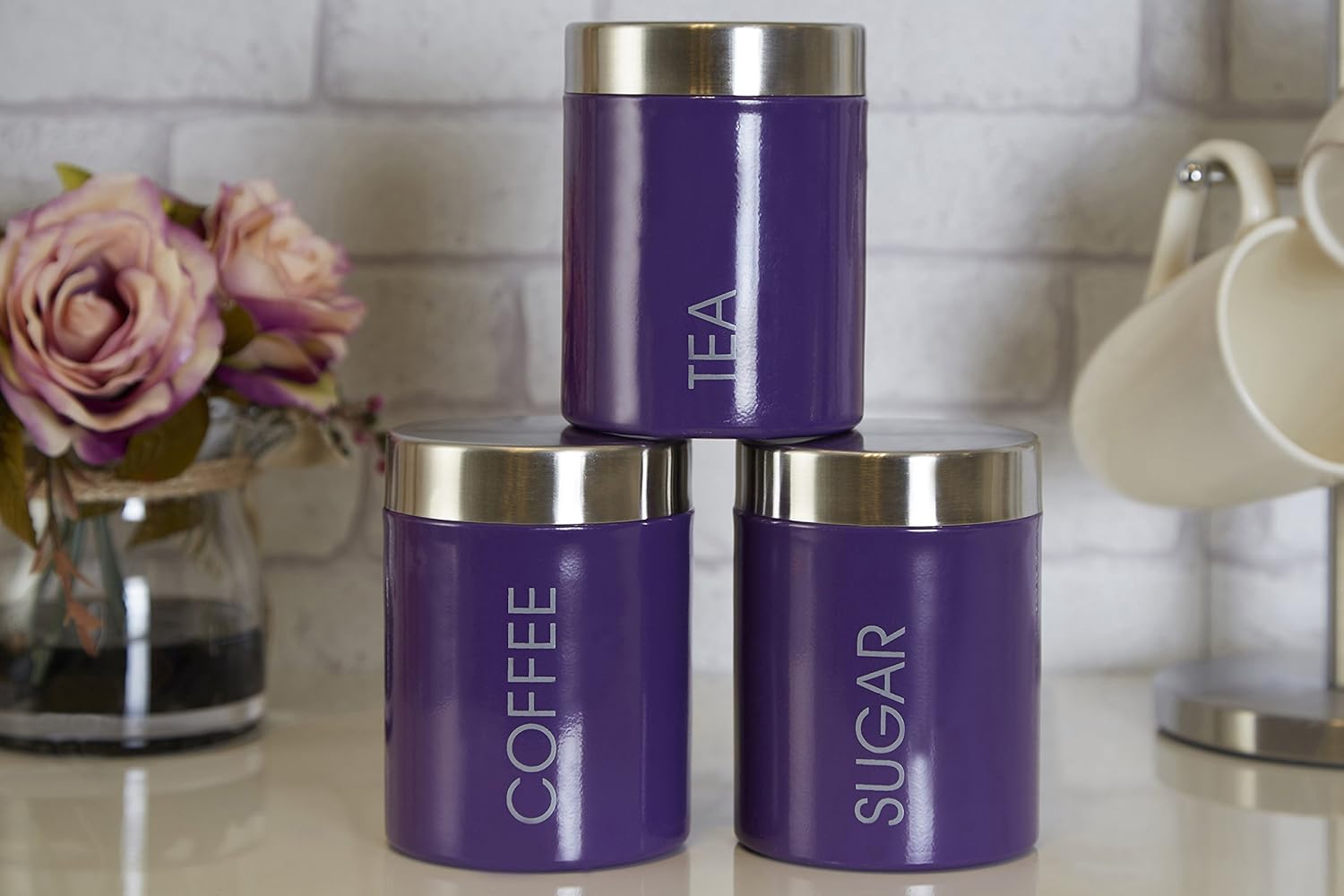 Set of 3 purpleĀ enamel tea, coffee & sugar canisters featuring a rubber seal, silver lid & silver word detail.