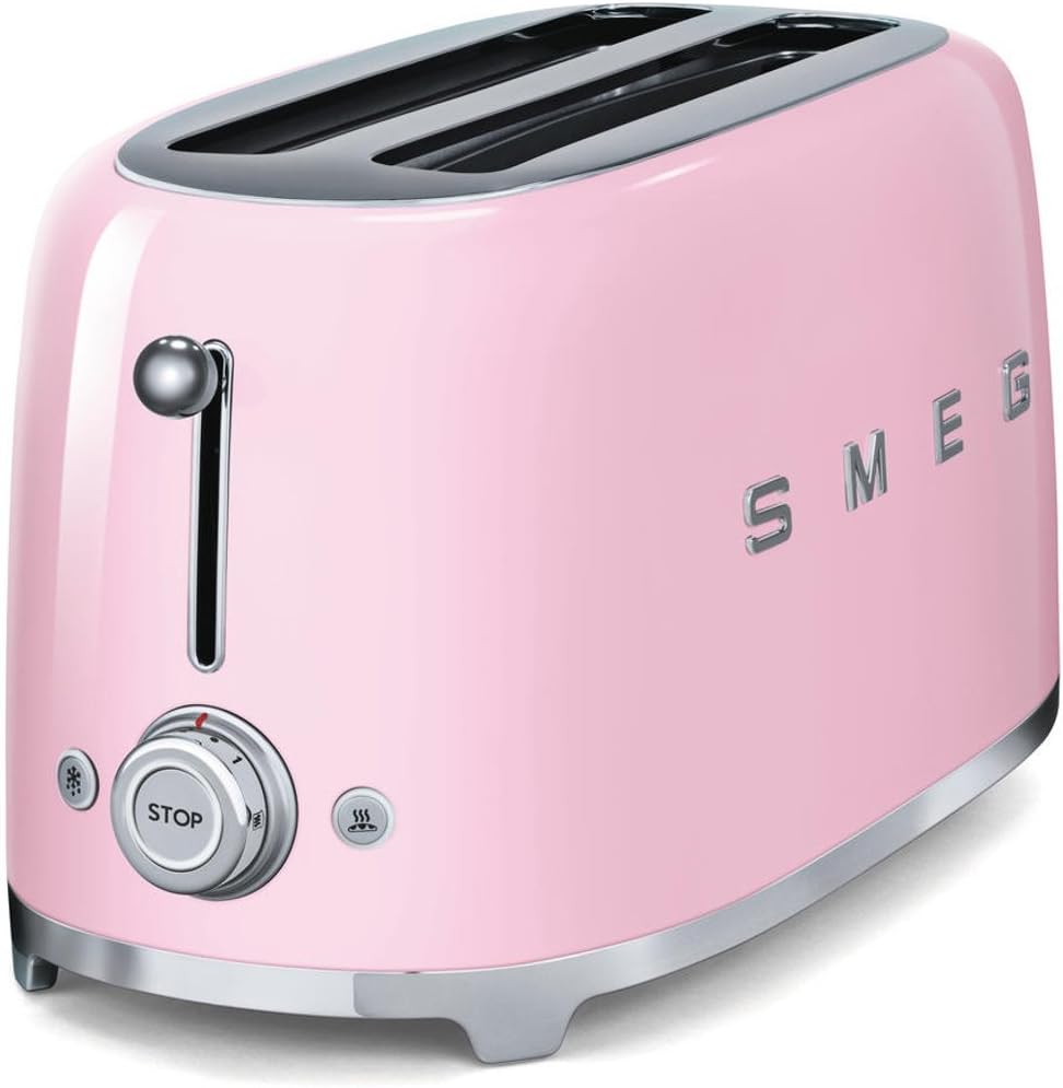Retro in style but truly modern in features, the pink Smeg toaster features a powder coated steel body, stainless steel ball lever knob and a backlit chrome knob.