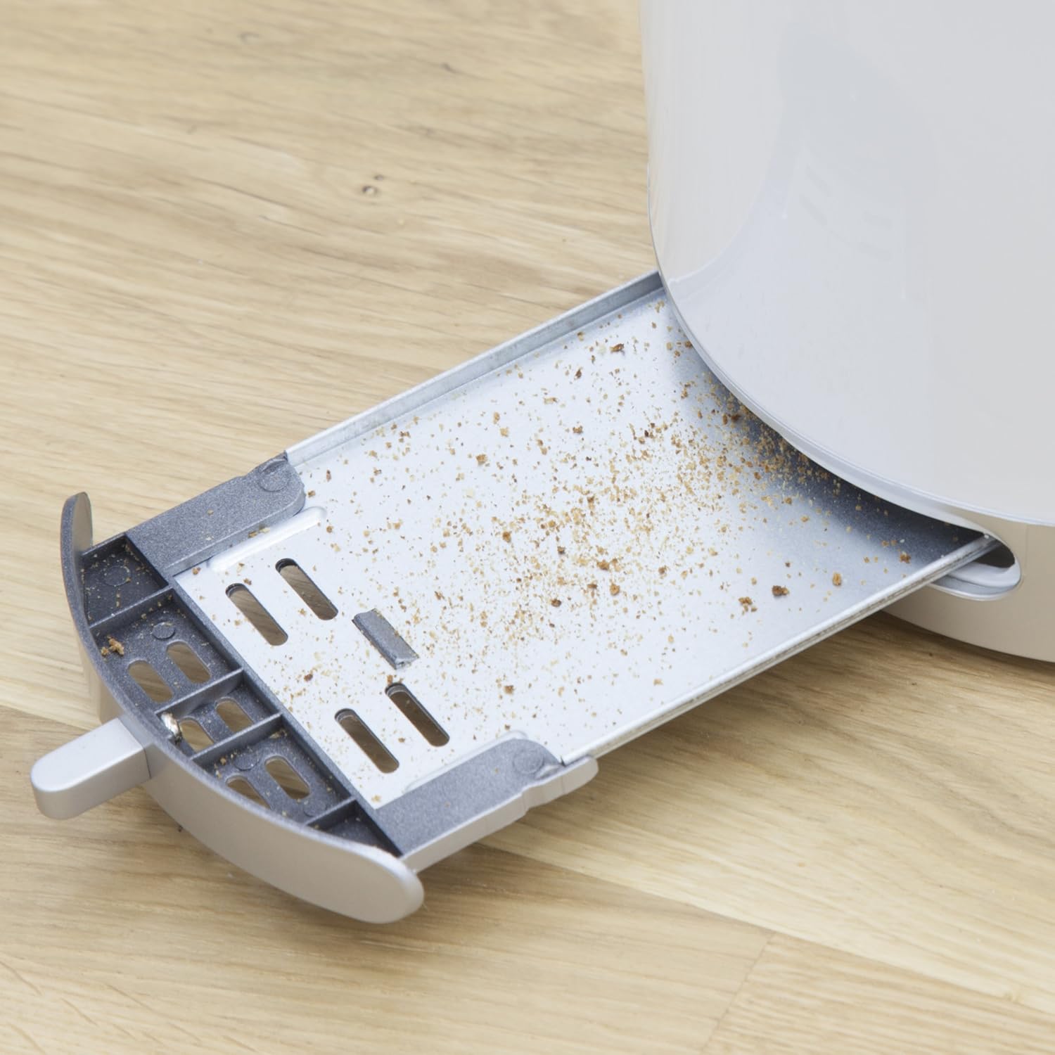 The 2 slice white toaster is easy to clean with non slip feet and a removable crumb tray, the toaster also features a high lift mechanism for lifting out smaller objects from the toaster without getting burnt.