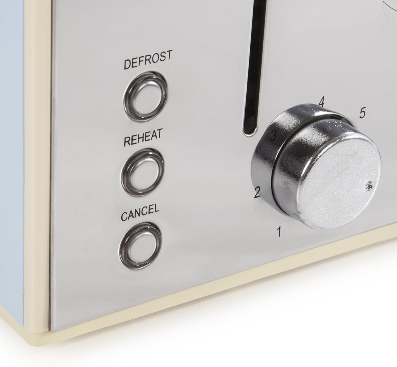 The duck egg blue toaster has an extra high-lift toast removal assisting removal of small sized breads and English muffins.