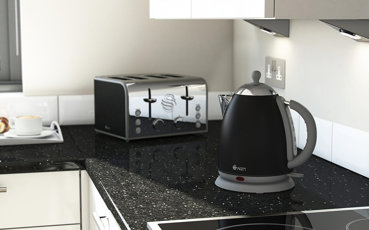 3kW SWAN Jug Kettle 1.7 Litre Black with cordless design & 360 Degree base. Also features an automatic cut off, concealed heating element, boil dry protection, rear water gauge & removable washable filter.