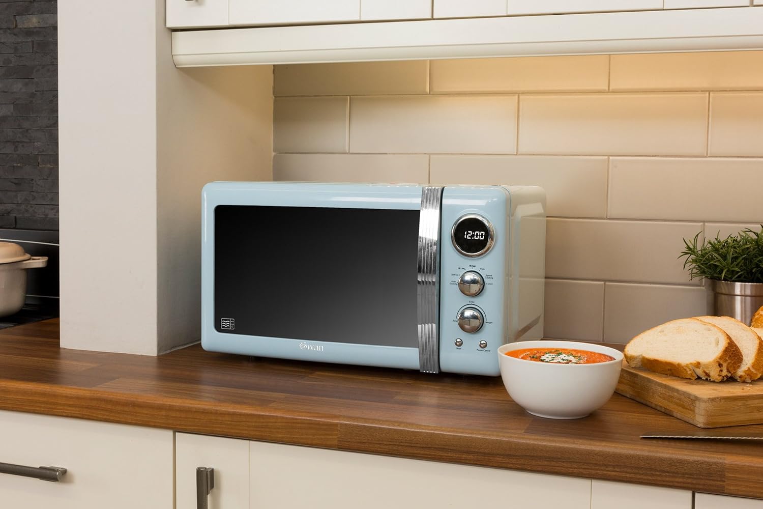 Swan Retro Duck Egg Blue Digital Microwave Oven has 5 power levels & a defrost setting. It features a 60 minute digital timer with digital display. It also comes with a cooking end signal, pull handle door and 245 mm glass turntable. Available in other colours.